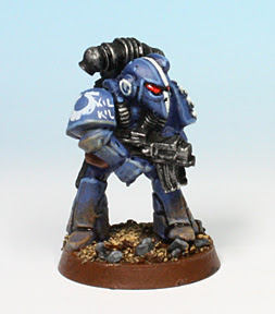 EDIT for Leadhead (previously posted on Quindia Studios blog, but I was remiss for not adding it here, so thanks for asking the question): All of my models start with a black undercoat. All of the paints were from the new Games Workshop range. I painted the armor with Macragge Blue, leaving the black showing in the recesses between plates. Then the model was given a wash of Drakenhof Nightshade. The next step was the most time consuming, though not nearly as much so on the modern marine models. I painted all of the armor plates again with Altdorf Guard Blue and left the darker colors showing in shadow areas - the underside of the legs and arms, around obvious joins int he armor, etc. In large flat areas, this meant blending the color out, but in small areas I simply left a fine line of the darker color showing. The final highlights were fast and consisted of Calgar Blue painted on the sharp edges of the armor (seen best on the helmet above).